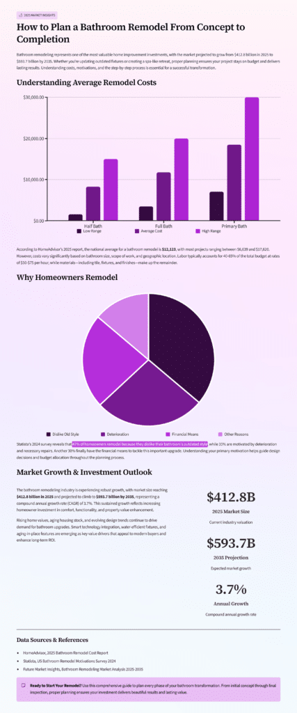 • Bathroom remodeling market size: $412.8B in 2025, projected $593.7B by 2035 (3.7% CAGR) Source: Future Market Insights 2025